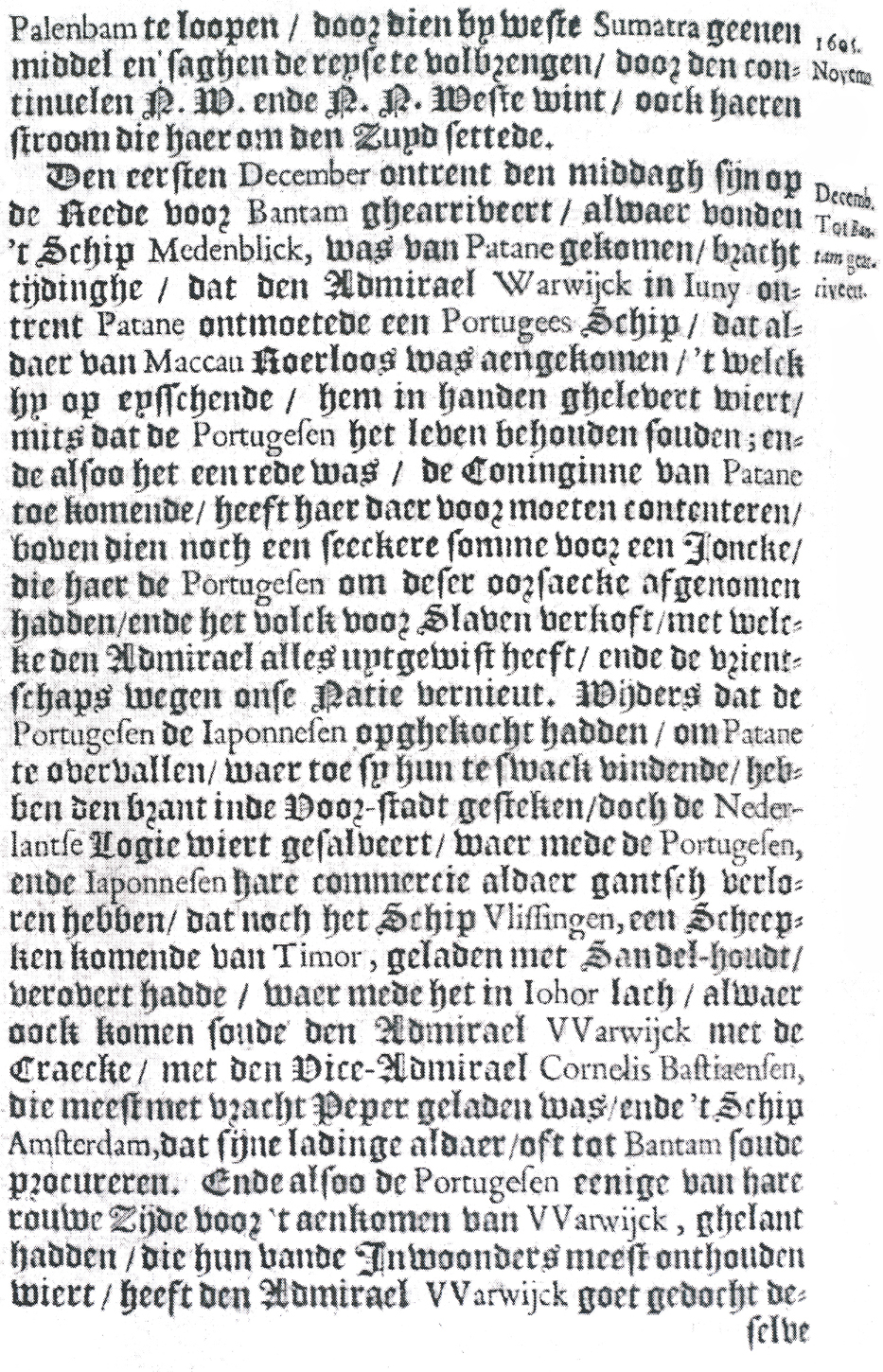 Palenbam te loopen, door dien by weste Sumatra geenen middel en saghen de reyse te volbrengen, door den continuelen N.W. ende N.N.Weste wint, oock haeren stroom die haer om den Zuyd settede. Den eersten December ontrent den middagh sijn op de Reede voor Bantam ghearriveert, alwaer vonden 't Schip Medenblick[1], was van Patane gekomen, bracht tijdinghe, dat den Admirael Warwijck in Iuny ontrent Patane ontmoetede een Portugees Schip, dat aldaer van Maccau Roerloos was aengekomen, 't welck hy opeysschende, hem in handen ghelevert wiert, mits dat de Portugesen het leven behouden souden; ende alsoo het een rede was, de Coninginne van Patane toe komende, heeft haer daer voor moeten contenteren, boven dien noch een seekere somme voor een Joncke, die haer de Portugesen om deser oorsaecke afgenomen hadden, ende het volck voor Slaven verkoft, met welcke den Admirael alles uyt gewist heeft, ende de vrientschaps wegen onse Natie vernieut. Wijders dat de Portugesen de Iaponnesen opghekocht hadden, om Patane te overvallen, waer toe sy hun te swack vindende, hebben den brant inde Voorstadt gesteken, doch de Nederlandse Logie[2] wiert gesalveert, waer mede de Portugesen, ende Iaponnesen hare commercie aldaer gantsch verloren hebben, dat noch het Schip Vlissingen, een Scheepken komende van Timor, geladen met Sandelhoudt, verovert hadde, waer mede het in Iohor lach, alwaer oock komen soude den Admirael Warwijck met de Craecke[3], met den Vice-admirael Cornelis Bastiaensen, die meest met vracht Peper geladen was, ende 't Schip Amsterdam, dat sijne ladinge aldaer, oft tot Bantam soude procureren. Ende alsoo de Portugesen eenige van hare rouwe Zijde voor 't aenkomen van VVarwijck, ghelant hadden, die hun vande Inwooners meest onthouden wiert, heeft den Admirael VVarwijck goet gedocht de- [1] Medemblik – 1603 – Jacht, gebruikt in gebruik bij de VOC vanaf 1603 tot na 1608 (Vergaan, Malediven) – Laadvermogen 250 ton - Reisgegevens: vertrek op 18 december 1603 van Texel naar Bantam aankomst 1604; kamer Hoorn; schipper Dirk Klaasz. Mooilieven. [2] Toen Wybrand van Warwijck als admiraal van de vloot der vereenigde O.I.C. op 20 Maart 1602 voor Bantam verscheen, wist deze te bewerken, dat de facteur aldaar een vaste, steenen ‘logie’ zou mogen bouwen, waarin Fr. Wittert tot president werd aangesteld, met Steven Doensz als onderkoopman (20 Aug. 1603), die tevens tot boekhouder en comptabel ambtenaar benoemd werd. [3] Wat een fregat was in het ene land, was een galjoen in het andere, en een kraak kon vrijwel alles zijn, van een Portugese driemaster met een zeer hoog achterdek tot een Vlaamse eenmaster zonder achterdek. |