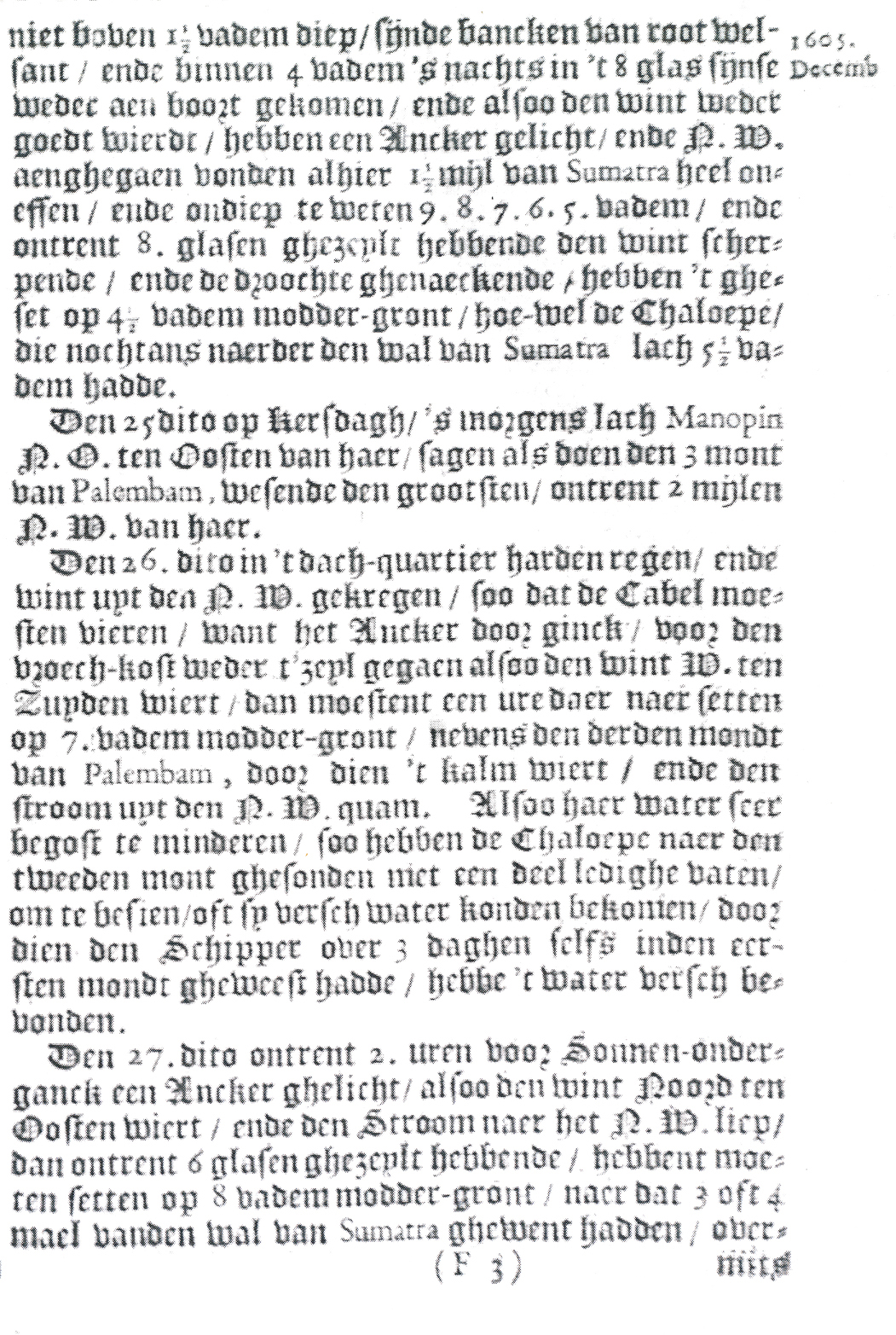 niet boven 1½ vadem diep, sijnde bancken van root welsant, ende binnen 4 vadem 's nachts in 't 8e glas[1] sijnse weder aan boort gekomen, ende alsoo den wint weder goedt wiert, hebben een Ancker gelicht, ende N.W. aenghegaan vonden alhier 1½ mijl van Sumatra heel oneffen, ende ondiep te weten 9, 8, 7, 6, 5 vadem, ende ontrent 8 glasen ghezeylt hebbende den wint scherpende, ende de droochte ghenaeckende, hebben 't gheset op 4½ vadem moddergront, hoewel de Chaloepe, die nochtans naerder den wal van Sumatra lach 5½ vadem hadde. Den 25e dito op Kersdagh, 's morgens lach Manopin N.O.ten Oosten van haer, sagen als doen den 3e mont van Palembam, wesende den grootsten, ontrent 2 mijlen N.W.van haer. Den 26e dito in 't dachquartier harden regen, ende wint uyt den N.W.gekregen, soo dat de Cabel moesten vieren, want het Ancker door ginck, voor den vroechkost weder t'zeyl gegaen alsoo den wint W.ten Zuyden wiert, dan moestent een ure daer naer setten op 7 vadem moddergront, nevens den derden mondt van Palembam, door dien 't kalm wiert, ende den stroom uyt den N.W.quam. Alsoo haer water seer begost te minderen, soo hebben de Chaloepe naer den tweeden mont ghesonden met een deel ledighe vaten, om te besien, oft sy versch water konden bekomen, door dien den Schipper over 3 daghen selfs inden eersten mondt gheweest hadde, hebbe 't water versch bevonden. Den 27e dito ontrent 2 uren voor Sonnenonderganck een Ancker gelicht, alsoo den wint Noord ten Oosten wiert, ende den Stroom naer het N.W,liep, dan ontrent 6 glasen ghezeylt hebbende, hebbent moeten setten op 8 vadem moddergront, naerdat 3 of 4 mael vanden wal van Sumatra ghewent hadden, over- [1] Een glas is een kleine zandloper, tijdmeter bestaande uit een in het midden ingesnoerd glas, ten dele gevuld met zand dat in een bepaalde tijd uit het ene deel in het andere valt; 8 glas is dus 8 maal keren. |