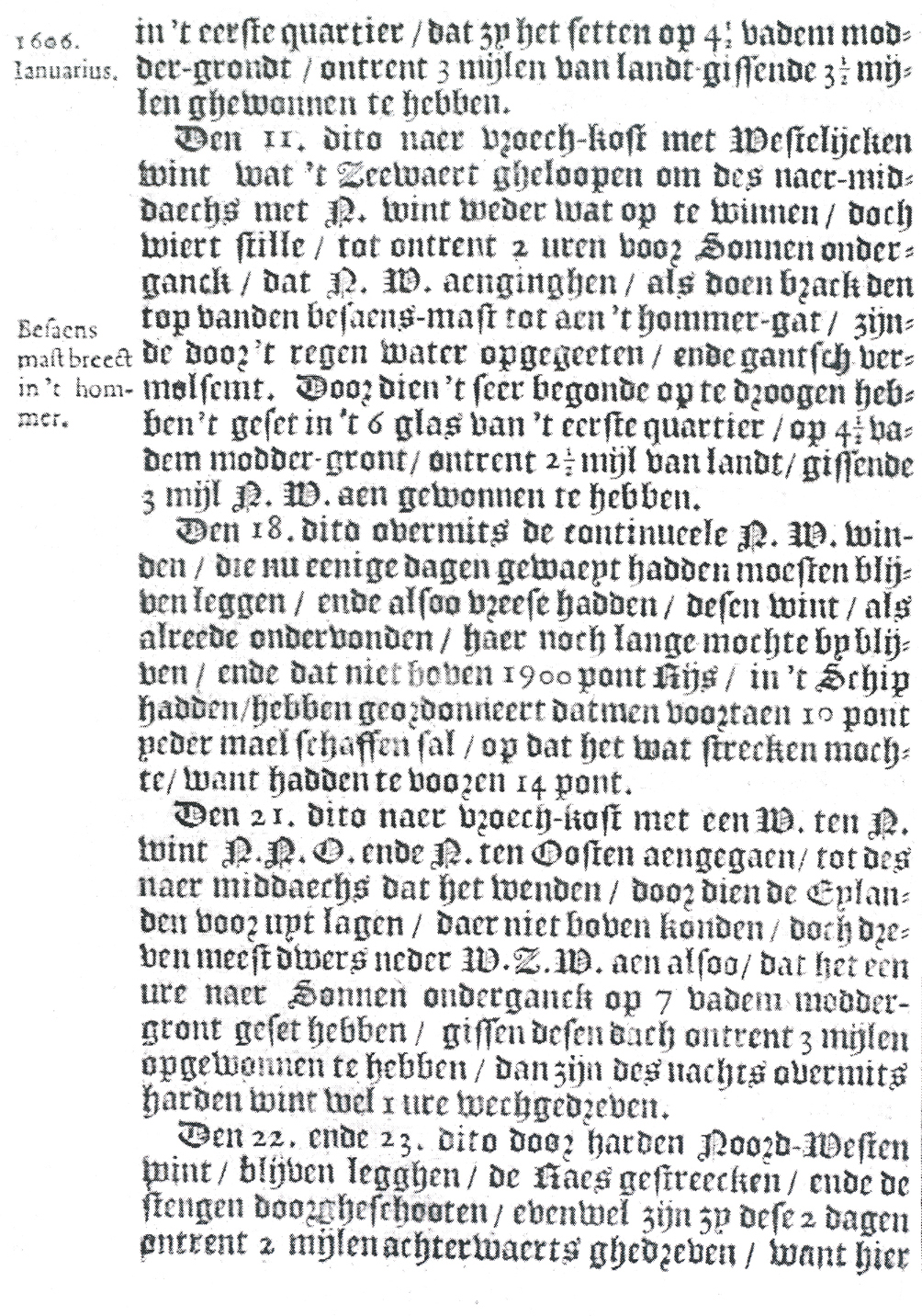 in 't eerste quartier, dat zy het setten op 4½ vadem moddergront, ontrent 3 mijlen van landt gissende 3½ mijlen ghewonnen te hebben. Den 11e dito naer vroechkost met Westelijcken wint wat 't Zeewaert gheloopen om des naermiddaechs met N.wint weder wat op te winnen, doch wiert stille, tot ontrent 2 uren voor Sonnen onderganck, dat N.W. aenginghen, als doen brack den top vanden besaensmast[1] tot aen 't hommergat, zijnde door 't regen water opgegeeten, ende gantsch vermolsemt. Doordien 't seer begonde op te droogen hebben 't geset in 't 6e glas van 't eerste quartier, op 4½ vadem moddergront, ontrent 2½ mijl van landt, gissende 3 mijl N.W. aen gewonnen te hebben. Den 18e dito overmits de continueele N.W.winden, die nu eenige dagen gewaeyt hadden moesten blijven leggen, ende alsoo vreese hadden, desen wint, als alreede ondervonden, haer noch lange mochte by blijven, ende dat niet boven 1900 pont Rijs, in 't Schip hadden, hebben geordonneert datmen voortaen 10 pont yeder mael schaffen sal, op dat het wat strecken mochte, want hadden te vooren 14 pont. Den 21e dito naer vroechkost met een W.ten N.wint N.N.O. ende N.ten Oosten aengegaen, tot des naer middaechs dat het wenden, door dien de Eylanden vooruyt lagen, daer niet boven konden, doch dreven meest dwers neder W.Z.W. aen alsoo, dat het een ure naer Sonnen onderganck op 7 vadem moddergront geset hebben, gissen desen dach ontrent 3 mijlem opghewonnen te hebben, dan zijn des nachts overmits harden wint wel 1 ure wechgedreven. Den 22e ende 23e dito door harden Noordwesten wint, blijven legghen, de Raes gestreecken, ende de stengen doorgheschooten, evenwel zij zy dese 2 dagen ontrent 2 mijlen achterwaerts ghedreven, want hier