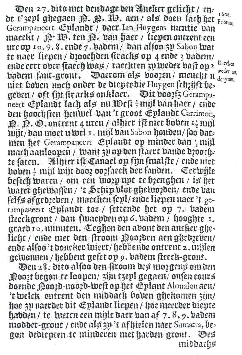 Den 27e dito met den dage den Ancker gelicht, ende t'zeyl ghegaen N.N.W. aen, als doen lach het Gerampaneert[1] Eylandt, daer Ian Huygens mentie van maeckt, N.W.ten N. van haer, liepen ontrent een ure op 10, 9, 8 ende 7 vadem, dan alsoo zy Sabon wat te naer liepen, droochden stracks op 4 ende 3 vadem, ende eerst over staech was, raeckten sy weder vast op 2 vadem santgront. Daerom als vooren, meucht niet boven noch onder de diepte die Huygen schrijft begeven, oft sijt stracks onklaer. Dit voorsz. Gerampaneert Eylandt lach als nu West ½ mijl van haer, ende den hoochsten heuvel van 't groot Eylandt Carrimon, N.N.O. ontrent 4 uren, alhier ist niet boven 1½ mijl wijt, dan moet u wel 1 mijl van Sabon houden, soo datmen het Gerampaneert Eylandt op minder dan ½ mijl mach aanloppen, want zy op den staert vande droochte saten. Alhier ist Canael op sijn smalste, ende niet boven ½ mijl wijt door oorsaeck der sanden. Terwijle besich waren, om een worp uyt te brenghen, is het water ghewassen, 't Schip vlot gheworden, ende vanselfs afgedreven, maecken seyl, ende liepen naer 't Gerampaneert Eylandt toe, settende het op 7 vadem steeckgront, dan swaeyden op 6 vadem, hooghte 1 graed 10 minuten. Teghen den avont den ancker ghelicht, ende met den stroom Noorden aen ghedreven, ende alsoo 't doncker wiert, hebbende ontrent 2 mijlen gewonnen, hebbent geset op 9 vadem steeckgront. Den 28e dito alsoo den stroom des morgens om den Noort begon te loopen, zijn t'zeyl gegaen, onsen cours doende Noordnoordwest op het Eylant Alonalon aen, 't welck ontrent den middach boven ghekomen zijn, hoe zy naerder dit Eylandt liepen, hoe meerder diepte hadden, te weten een mijle daer van af 7, 8, 9 vadem moddergront, ende als zy 't afhielen naer Sumatra, begon de diepten te minderen met harden gront. Des |