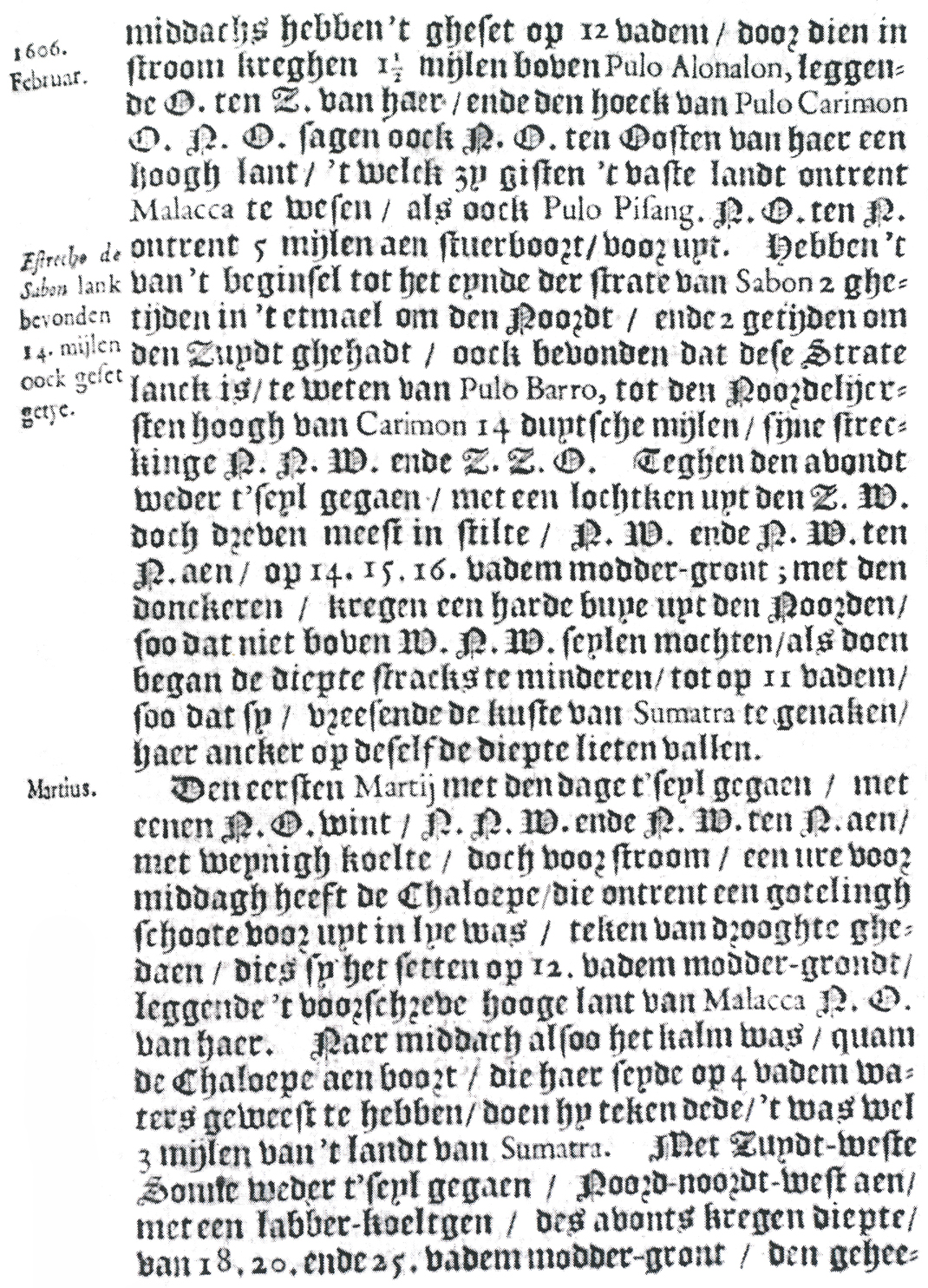middachs hebben 't gheset op 12 vadem, door dien in stroom kreghen 1½ mijlen boven Pulo Alonalon. Leggende O.ten Z. van haer, ende den hoeck van Pulo Carimon O.N.O. sagen oock N.O.ten Oosten van haer een hoogh lant, 't welck zy gisten 't vaste landt ontrent Malacca te wesen, als oock Pulo Pisang N.O.ten N. ontrent 5 mijlen aen stuerboort, vooruyt. Hebben 't van 't beginsel tot het eynde der strate van Sabon 2 ghetijden in 't etmael om den Noordt, ende 2 getijden om den Zuydt ghehadt, oock bevonden dat dese Strate lanck is, te weten van Pulo Barro, tot den Noordelijcrsten hoogh van Carimon 14 duytsche mijlen[1], sijne streckinge N.N.W. ende Z.Z.O. Teghen den avondt weder t'seyl gegaen, met een lochtken uyt den Z.W. doch dreven meest in stilte, N.W.ende N.W.ten N.aen, op 14, 15, 16 vadem moddergront; met den donckeren, kregen een harde buye uyt den Noorden, soo dat niet boven W.N.W. seylen mochten, als doen began de diepte stracks te minderen, tot op 11 vadem, soo dat sy, vreesende de kuste van Sumatra te genaken, haer ancker op deselfde diepte lieten vallen. Den eersten Martij met den dage t'seyl gegaen, met eenen N.O.wint, N.N.W. ende N.W.ten O. aen, met weynigh koelte, doch voor stroom, een ure voor middagh heeft de Chaloepe, die ontrent een gotelingh schoote voor uyt in lye was, teken van drooghte ghedaen, dies sy het setten op 12 vadem moddergrondt, leggende 't voorschreve hooge lant van Malacca N.O. van haer. Naer middach alsoo het kalm was, quam de Chaloepe aen boort, die haer seyde op 4 vadem waters geweest te hebben, doen hy teken dede, 't was wel 3 mijlen van 't landt van Sumatra. Met Zuydtweste Sonne weder t'seyl gegaen, Noordnoordtwest aen, met een labberkoeltgen, des avonts kregen diepte, van 18, 20 ende 25 vadem moddergront, den gehee- |
