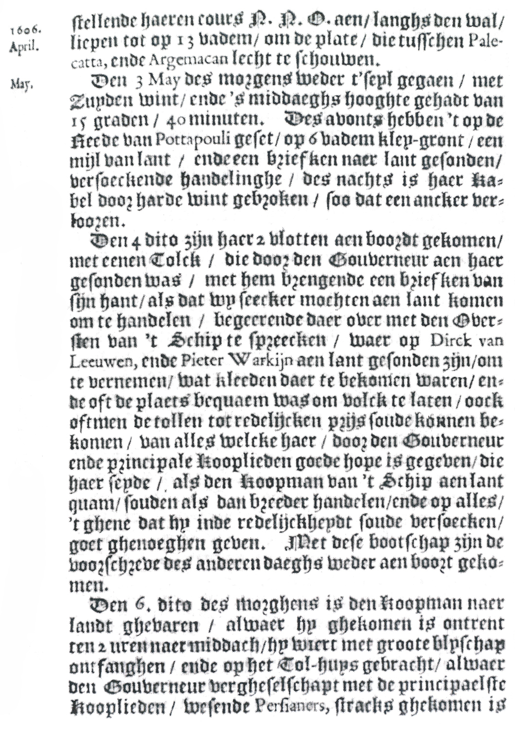 stellende haeren cours N.N.O. aen, langhs den wal, liepen tot op 13 vadem, om de plate, die tusschen Palecatta, ende Argemacan lecht te schouwen.[1] Den 3e May des morgens weder t'seyl gegaen, met Zuyden wint, ende 's middaeghs hooghte gehadt van 15 graden, 40 minuten. Des avonts hebben 't op de Reede van Pottapouli geset, op 6 vadem kleygront, een mijl van lant, ende een briefken naer lant gesonden, versoeckende handelinghe, des nachts is haer kabel door harde wint gebroken, soo dan een ancker verlooren. Den 4e dito zijn haer 2 vlotten aen boordt gekomen, met eenmen Tolck, die door den Gouverneur aen haer gesonden was, met hem brengende een briefken van sijn hant, als dat wy seecker mochten aen lant komen om te handelen, begeerende daer over met den Oversten van 't Schip te spreecken, waer op Dirck van Leeuwen, ende Pieter Warkijn aen lant gesonden zijn, om te vernemen, wat kleeden daer te bekomen waren, ende oft de plaets bequam was om volck te laten, oock oftmen de tollen tot redelijcken prijs soude konen bekomen, van alles welcke haer, door den Gouverneur ende principale kooplieden goede hope is gegeven, die haer seyde, als den Koopman van 't Schip aen lant quam, souden als dan breeder handelen, ende op alles 't ghene dat hy inde redelijckheydt soude versoecken, goet ghenoeghen geven. Met dese boodschap zijn de voorschreve des anderen daeghs weder aen boort gekomen. Den 6e dito des morghens is den Koopman naer landt ghevaren, alwaer hy ghekomen is ontrent ten 2 uren naer middach, hy wiert met groote blyschap ontvangen, ende op het Tolhuys gebracht, alwaer den Gouverneur vergheselschapt met de principaelste kooplieden, wesende Persianers, stracks ghekomen is [1] Deze passage over de handelspositie aan de kust van Koromandel wordt door Heert Terpstra uitgebreid gebruikt in zijn studie over de Nederlanders in Voor-Indië, 1947, pag 43 e.v.. Ook De vestiging van de Nederlanders aan de kust van Koromandel, door Heert Terpstra, de Waal, 1911 met minstens 16 verwijzingen. Ook in: De opkomst van het Nederlandsch gezag over Ceilon, door Willem van Geer. |