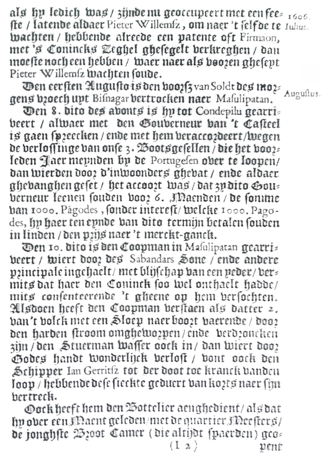 als hy ledich was, zijnde nu geoccupeert met een feeste, latende aldaer Pieter Willemsz, om naer 't selfde te wachten, hebbende alreede een patente oft Firmaon met 's Conincks Zeghel ghesegelt verkreghen, Dan moeste noch een hebben, waer naer als vooren gheseyt Pieter Willemsz wachten soude. Den eersten Augusto is den voorsz van Soldt des morgens vroech uyt Bisnagar vertrocken naer Masulipatan.[1] Den 8e dito des avonts is hy tot Condepilu gearriveert, alwaer den Gouverneur van 't Casteel is gaen spreecken, ende met hem veraccordeert, wegen de verlossinge van onze 3. Bootsgesellen, die het voorleden Jaer meynden by de Portugesen over te loopen, dan wierden door d'inwoonders ghevat, ende aldaer ghevanghen geset, het accort was, dat zy dito Gouverneur leenen souden voor 6 Maenden, de somme van 1000 Pagodes, sonder interest, welcke 1000 Pagodes, hy haer ten eynde van dito termijn betalen souden in linden, den prijs naer 't mercktganck. Den 10e dito is den Coopman in Masulipatan gearriveert, wiert door des Sabanders Sone, ende andere principale ingehaelt, met blijschap van een yeder, vermits dat haer den Coninck soo wel onthaelt hadde, mits consenteerdende 't gheene op hem versochten. Alsdoen heeft den Coopman verstaen als datter 2 van 't volck met een Sloep naer boort vaerende, door den harden stroom omgheworpen, ende verdroncken zijn, den Stuerman wasser oock in, dan wiert door Godes handt wonderlijck verlost, vont oock den Schipper Ian Gerritsz tot der doot toe kranck vanden loop, hebbende dese sieckte geduert van korts naer sijn vertreck. Oock heeft hem den Bottelier aenghedient, alsdat hy over een Maent geleden, met de quartier Meesters, de jonghste Broot Camer (die altijdt spaerden) geo- [1] In de Werken uitgegeven door de Linschoten-Vereeniging, volume 73 wordt op pag.72 gemeld dat de eerste nederzetting [loge] van de Hollanders in Masulipatam gesticht is in 1605, toen de Delft met Paulus van Solt voor het eerst de kust van Koromandel aandeed en een tweede loge te Petapoeli in 1606 bij het tweede bezoek. In Geschiedenis van Nederlandsch Indië van Frederik Willem Stapel (1879-1957) wordt in deel 4: De Nederl. Oost-Indische Compagnie in de achttiende eeuw door Everhardus Cornelis Godée Molsbergen (1875-1940) op pag 53 gezegd dat in 1605 de Hollandse Loge in Masulipatnam door de Guilliam Lodewijckx is gesticht en onder leiding van Pieter Isaäcx Eysloff als koopman is achter gelaten, toen hij zelf terugkeerde naar Bantam. |