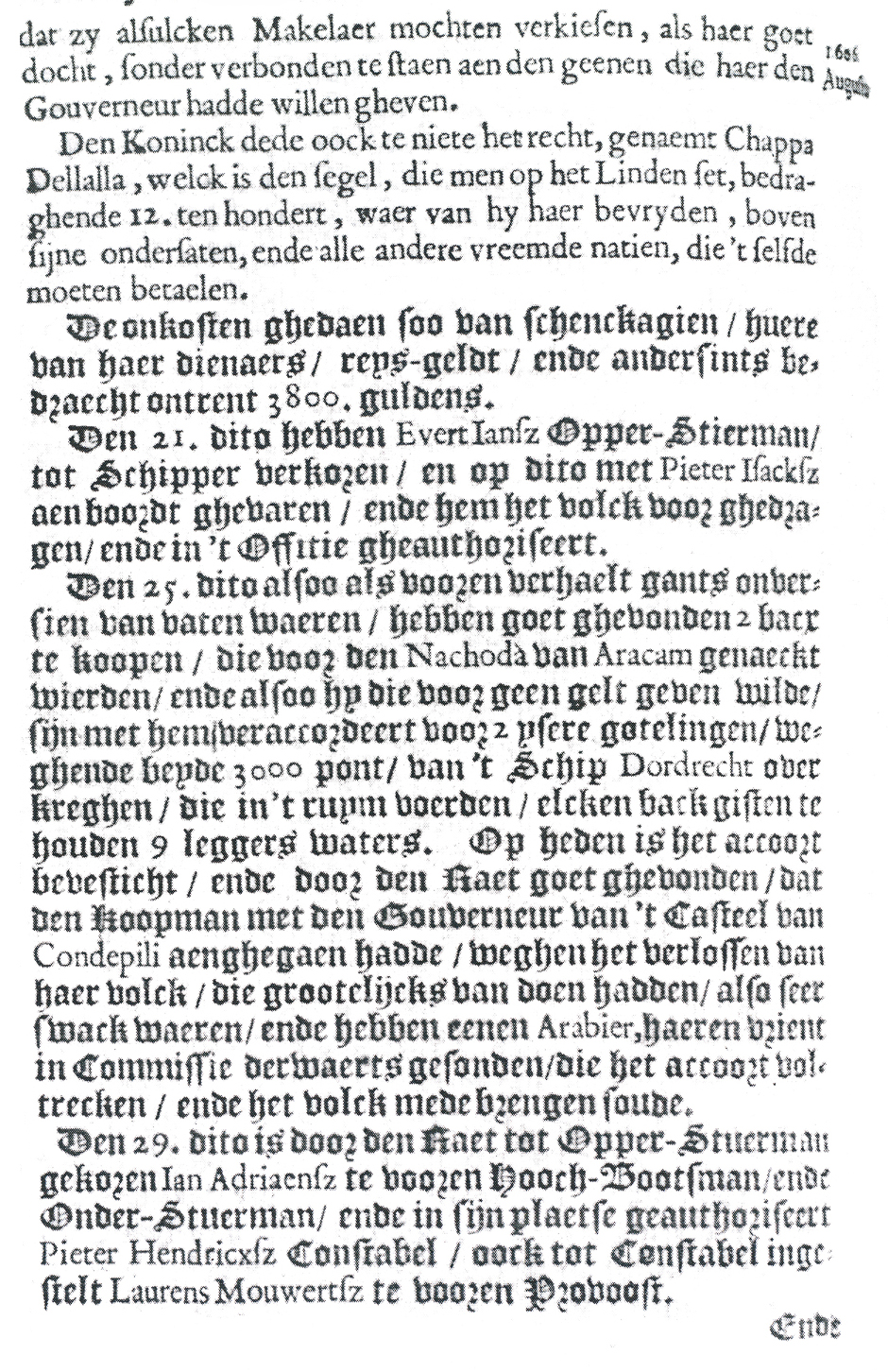 dat zy alsulcken Makelaer mochten verkiesen, als haer goet docht, sonder verbonden te staen aen den geenen die haer den Gouverneur hadde willen gheven. Den Koninck dede oock te niete het recht, genaemt Chappa Dellalla, welck is den segel, die men op het Linden set, bedraghende 12. ten hondert, waer van hy haer bevryden, boven sijne onder saten, ende alle andere vreemde natien, die 't selfde moeten betaelen. De onkosten ghedaen soo van schenckagien, huere van haer dienaers, reysgeldt, ende andersints bedraecht ontrent 3800 guldens.[1] Den 21e dito hebben Evert Iansz Opperstierman, tot Schipper verkozen, en op dito met Pieter Isacksz aenboordt ghevaren, ende hem het volck voor ghedragen, ende in 't Offitie gheauthoriseert. Den 25e dito alsoo als vooren verhaelt gants onversien van vaten waeren, hebben goet ghevonden 2 bacr te koopen, die voor den Nachodà van Aracam genaeckt wierden, ende alsoo hy die voor geen gelt geven wilde, sijn met hem, veraccordeert voor 2 ysere gotelingen, weghende beyde 3000 pont, van 't Schip Dordrecht over kreghen, die in 't ruym voerden, elcken back gisten te houden 9 leggers waters. Op heden is het accoort bevesticht, ende door den Raet goet ghevonden, dat den Koopman met den Gouverneur van 't Casteel van Condepili aenghegaen hadde, weghen het verlossen van haer volck, die grootelijcks van doen hadden, alsoo seer swack waeren, ende hebben eenen Arabier, haeren vrient in Commissie derwaerts gesonden, die het accoort voltrecken, ende het volck mede brengen soude. Den 29e dito is door den Raet tot Opperstuerman gekozen Ian Adriaensz te vooren Hoochbootsman, ende Onderstuerman, ende in sijn plaetse geauthoriseert Pieter Hendricxsz Constabel, oock tot Constabel ingestelt Laurens Mouwertsz te vooren Provoost. |