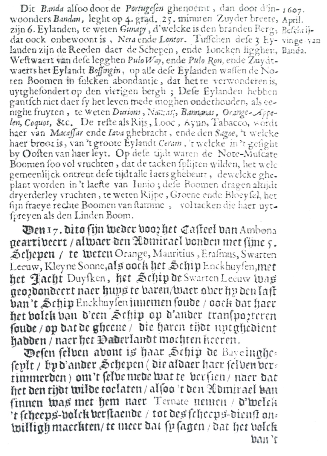 Beschrijvinge van Banda Dit Banda alsoo door de Portugesen ghenoemt, dan door d'inwoonders Bandam, leght op 4 grad.25 minuten Zuyder breete, zijn 6 Eylanden, te weten Gunapy, d'welcke is den branden Berg, dat oock onbewoont is, Nera ende Lontor. Tusschen dese 3 Eylanden zijn de Reeden daer de Schepen, ende Ioncken ligghen, Westwaert van dese legghen Pulo Way, ende Pulo Ron, ende Zuydtwaerts het Eylandt Bossingin, op alle dese Eylanden wassen de Notenboomen in sulcken abondantie, dat het te verwonderen is, uytghesondert op den vierigen berch; Dese Eylanden hebben gantsch niet daer sy het leven mede moghen onderhouden, als eenighe fruyten, te weten Durions, Nancasy, Bananas, Orange-appelen, Coquos, &c. De reste als Rijs, Looc, Ayun, Tabacco, wordt haer van Macassar ende Iava ghebracht, ende den Sagoe, 't welcke haer broot is, van 't groote Eylandt Ceram, 't welke in 't ghesicht by Oosten van haer leyt. Op dese tijdt waren de Notemuscate Boomen soo vol vruchten, dat de tacken splijten wilden, hetwelc gemeenlijck ontrent dese tijdt alle Iaers ghebeurt, dewelcke gheplant worden in 't laeste van Iunio; dese Boomen dragen altijdt dryerderley vruchten, te weten Rijpe, Groene ende Bloeysel, het sijn fraeye rechte Boomen van stamme, voltacken die haer uytspreyen als den Linden Boom.[1] Den 17e dito sijn weder voor het Casteel van Ambona gearriveert, alwaer den Admirael vonden met sijne 5 Schepen, te weten Orange, Mauritius, Erasmus, Swarten Leeuw, Kleyne Sonne, als oock het Schip Enckhuysen, met het Jacht Duyfken, het Schip de Swarten Leeuw was geordonneert naer huys te varen, waer over hy den last van 't Schip Enckhuysen innemen soude, oock dat haer het van d'een Schip op d'ander transporteren soude, op dat gheene, die haren tijdt uytghedient hadden, naer het Vaderlandt mochten keeren. Desen selven avont is haar Schip de Baye ingheseylt, by d'ander Schepen (die aldaer haer selven vertimmerden) om 't selve mede wat te versien, naer dat het den tijdt wilde toelaten, alsoo 't den Admirael van sinnen was met hem naer Ternate nemen, d'welck 't scheepsvolck verstaende, tot de scheepsdienst onwilligh maeckten, te meer dat sy sagen, dat het volck |